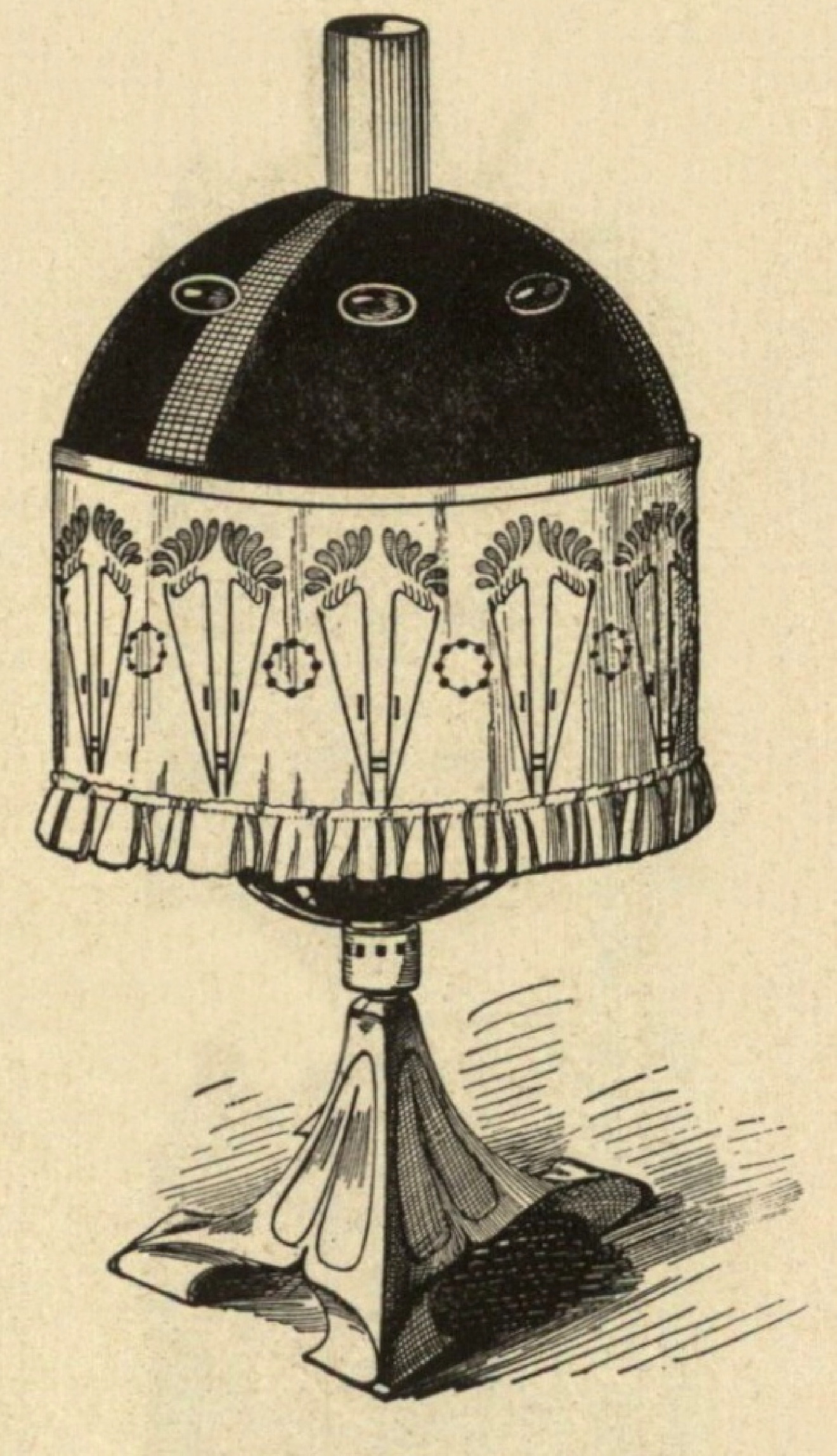 Tak zwane lampki studenckie mają podstawę w formie gładkiego lichtarza, rezerwoar i na wierzch idącą umbrelkę, wszystko z bronzowo lakierowanego metalu. Lampka taka choć na pokój niewiele światła rzuca, wybornie wszakże przedmiot pracy oświetli, bardzo mało potrzebując nafty.