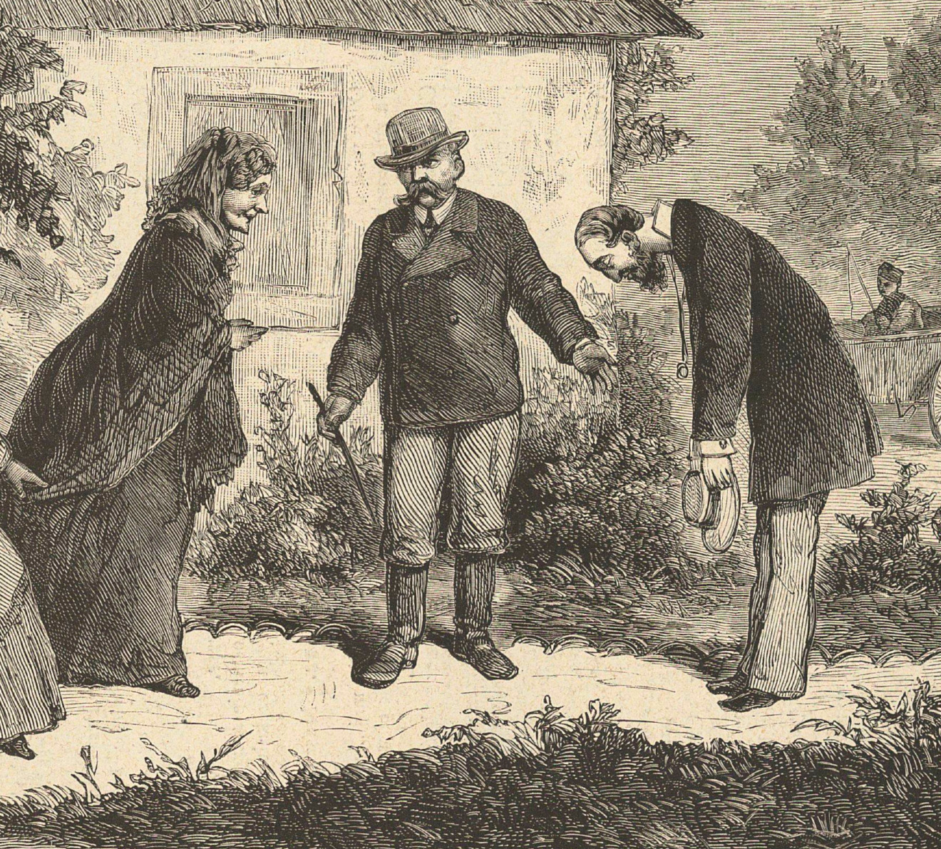 Mężczyźni w kilku idący kłaniają się wszyscy, gdy jeden z nich składa ukłon znajomej damie.