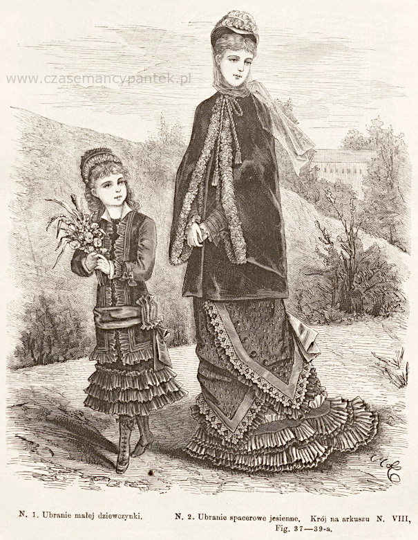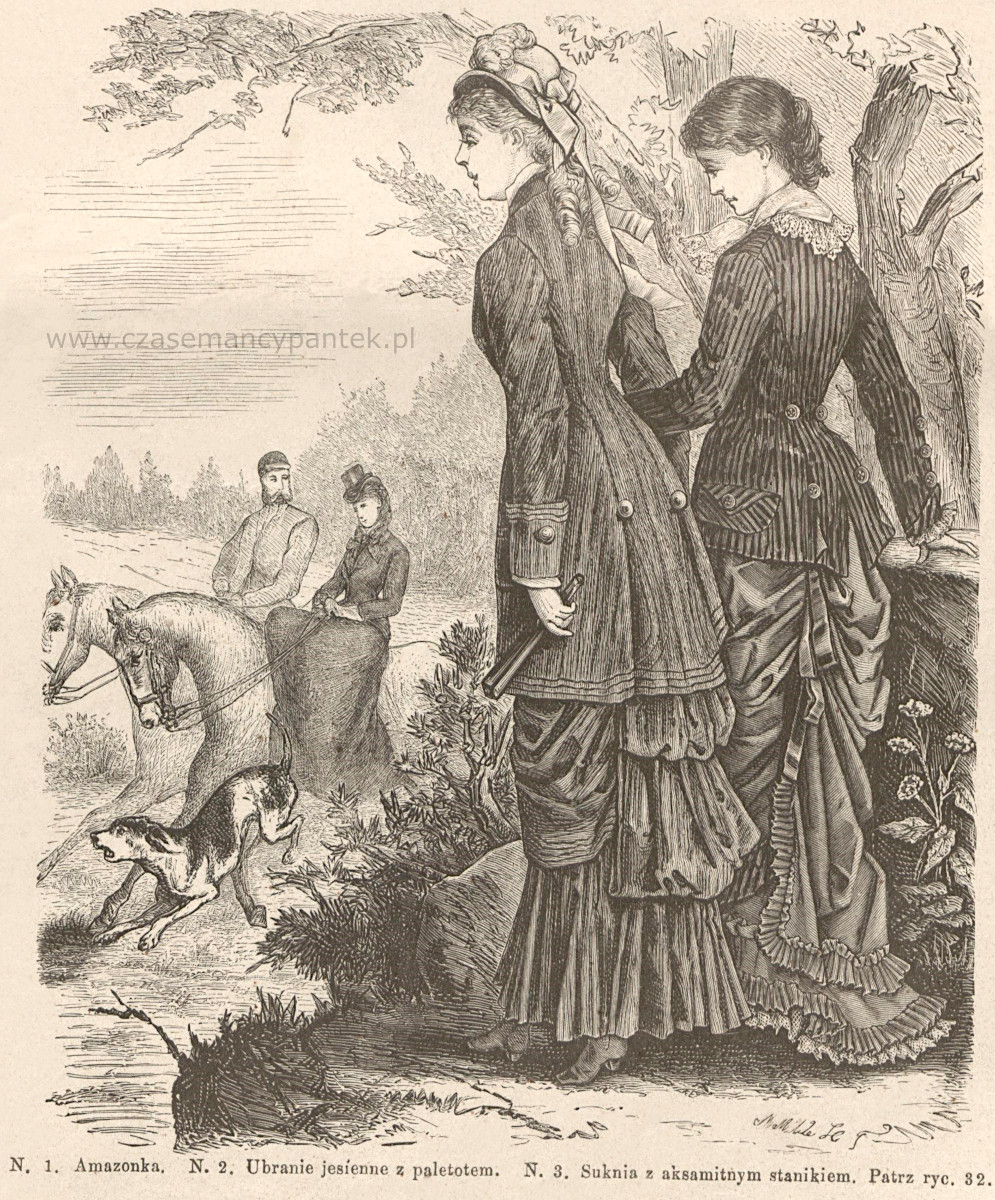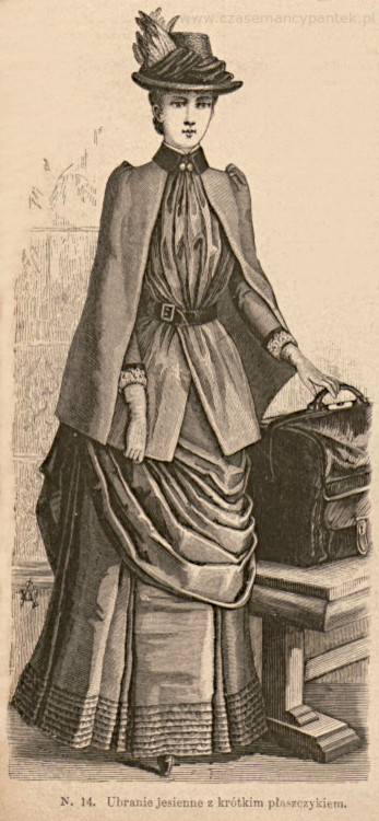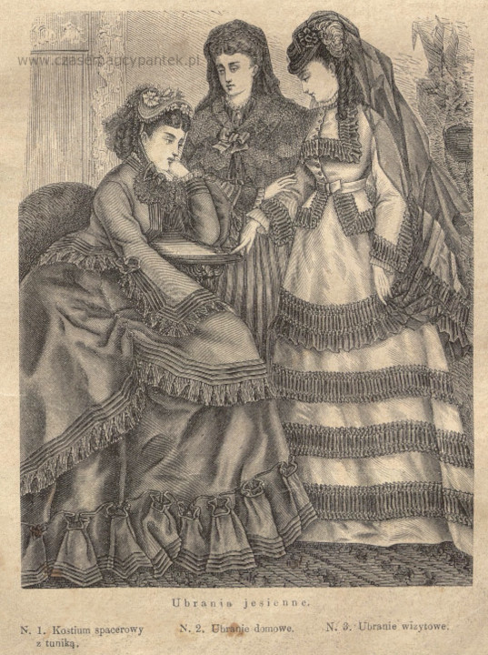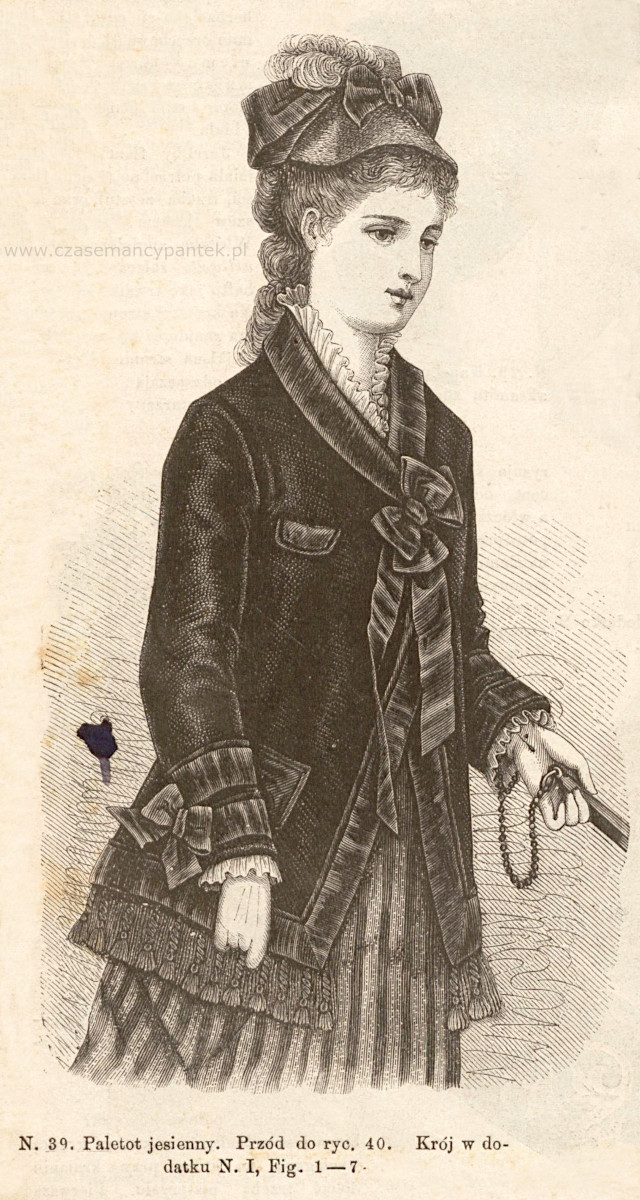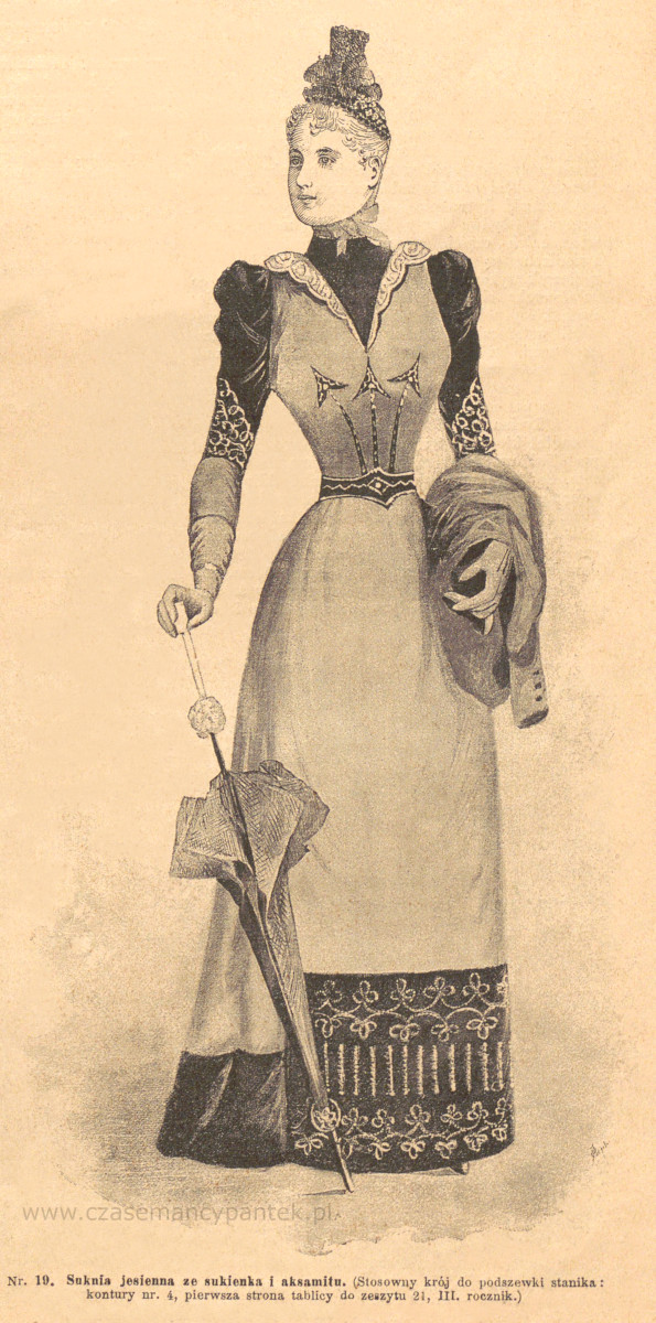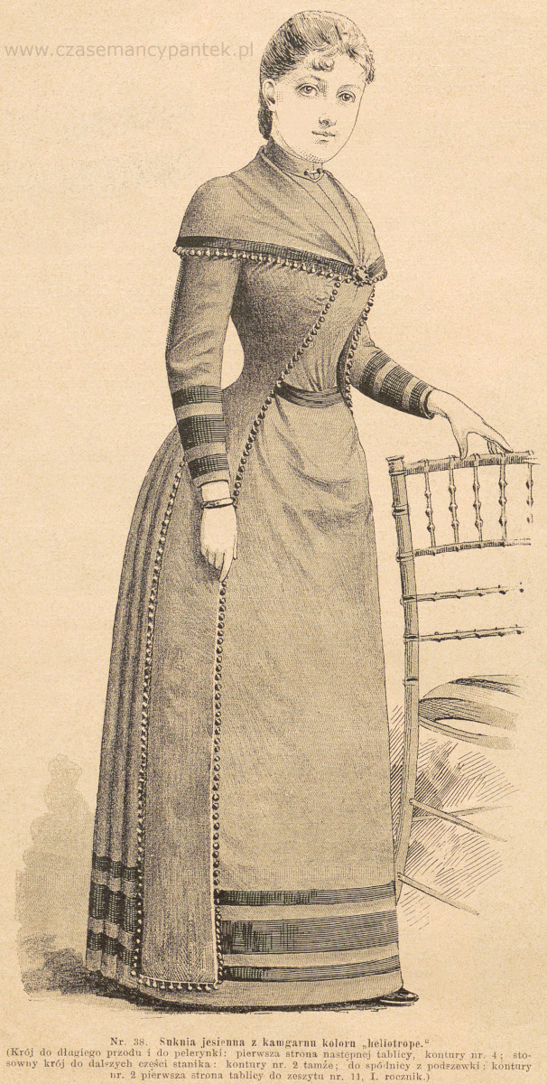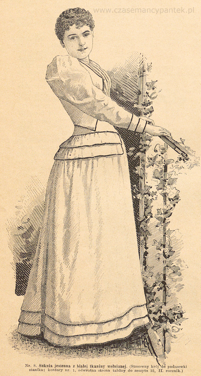Uważaliśmy także skromny ale gustowny kostium jesienny, złożony ze spódnicy wigoniowej popielatej z takąż żakietką. U dołu nad obrębem kilka rzędów przepikowanych czarnym jedwabiem tworzy cały garnirunek. Żakietka do figury, otwarta na przedzie; dwa wielkie kołnierze, jeden nad drugim, przepikowane u brzegu, pokrywają stan do połowy, niżej naszyte rzędem z każdej strony trzy wielkie guziki szmuklerskie. Pod spód idzie biała sukienna kamizelka, wyszyta w ukośne prążki czarnym jedwabnym sutaszem, zasznurowana z przodu. U szyi takaż obróżka, oprócz tego podniesiony kołnierzyk médicis, z czarnego aksamitu, łączy się z otworem żakietki. Rękawy szerokie wgórze, wązkie od łokcia, u ręki przepikowane sutaszem.