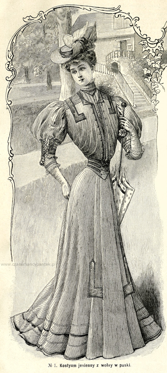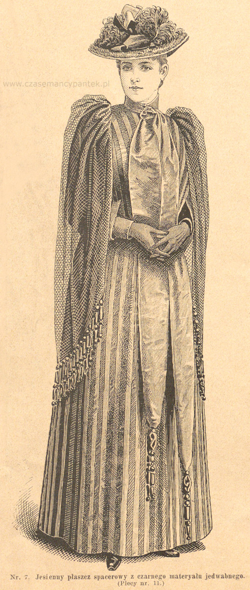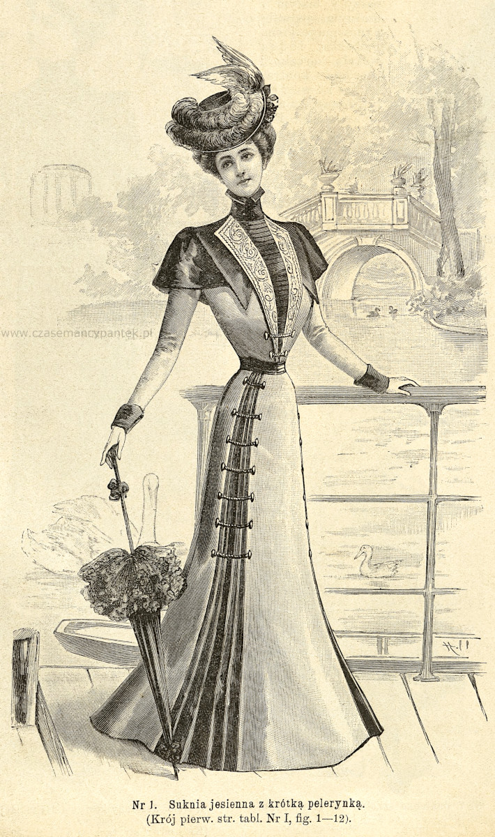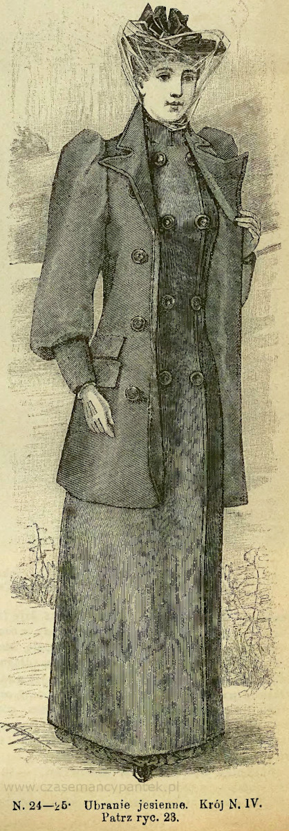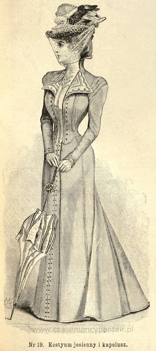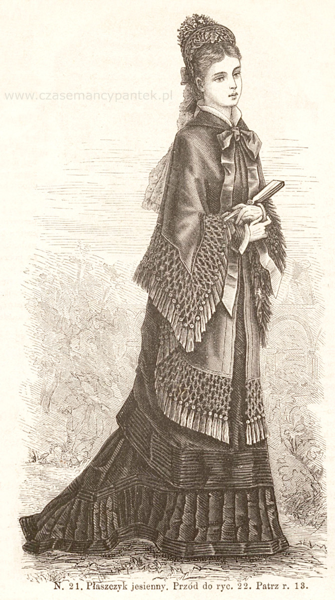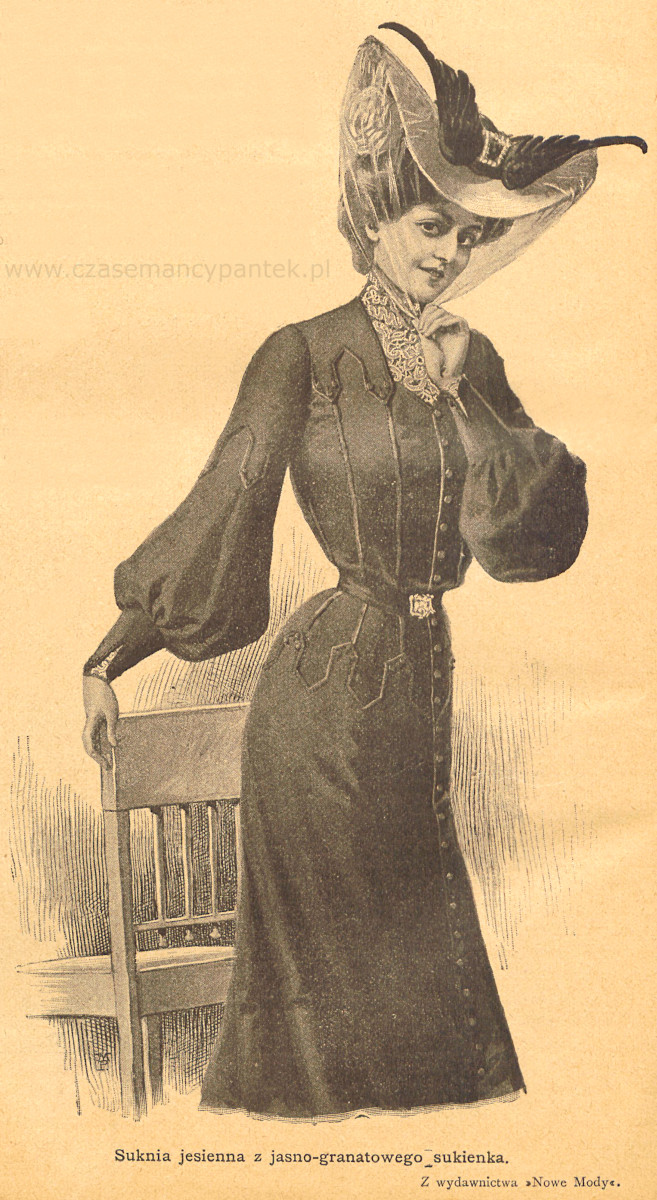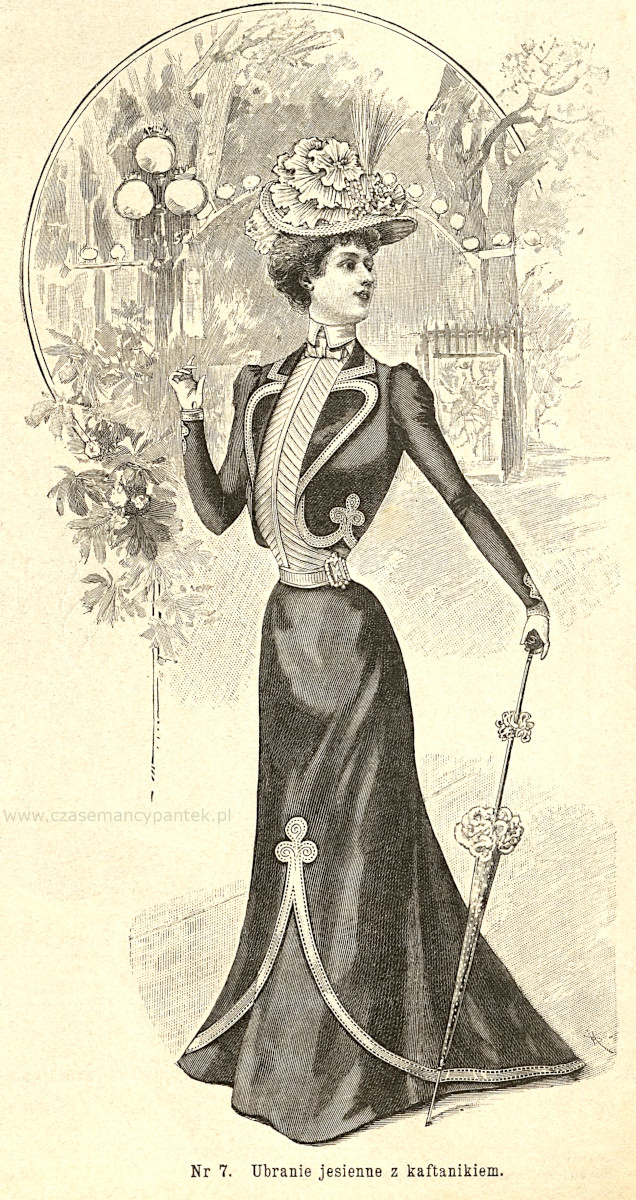 Okrywki jesienne zaczynają ukazywać się na ulicy. Do najświeższych należą z sukienka lub wigoniu w kolorze szafirowym albo wydrowym, przystają zupełnie do figury. Plecy ich złożone z trzech części, tworzą krótką żakietkę, na dwóch bocznych szwach idzie szlaczek wązki, wyszyty czarnym jedwabnym sutaszem. Przody także obcisłe, długie prawie do ziemi, spinają się na niewidzialne haftki. Po obu brzegach od ramienia do dołu, ciągnie się szlak bogato sutaszowany. Kołnierz do tego Medicis, podniesiony wysoko w górę, odwinięty po bokach. Rękawy szerokie, otwarte, u ramienia mocno namarszczone, podwinięte u ręki.