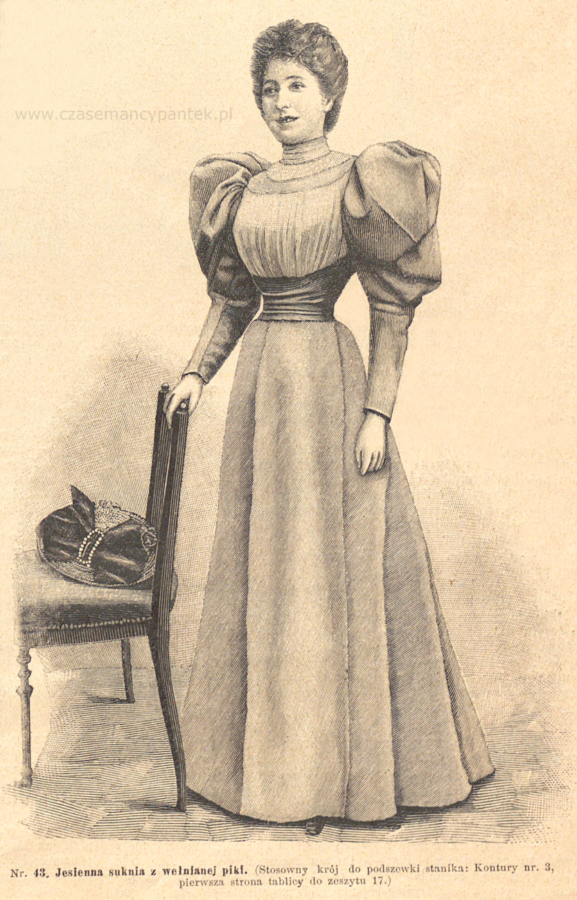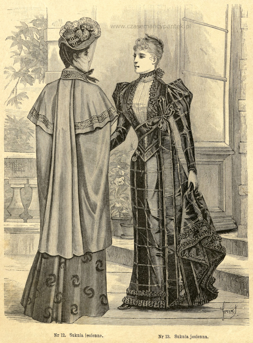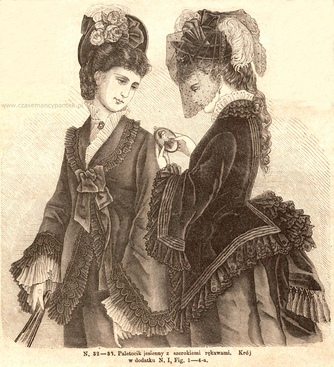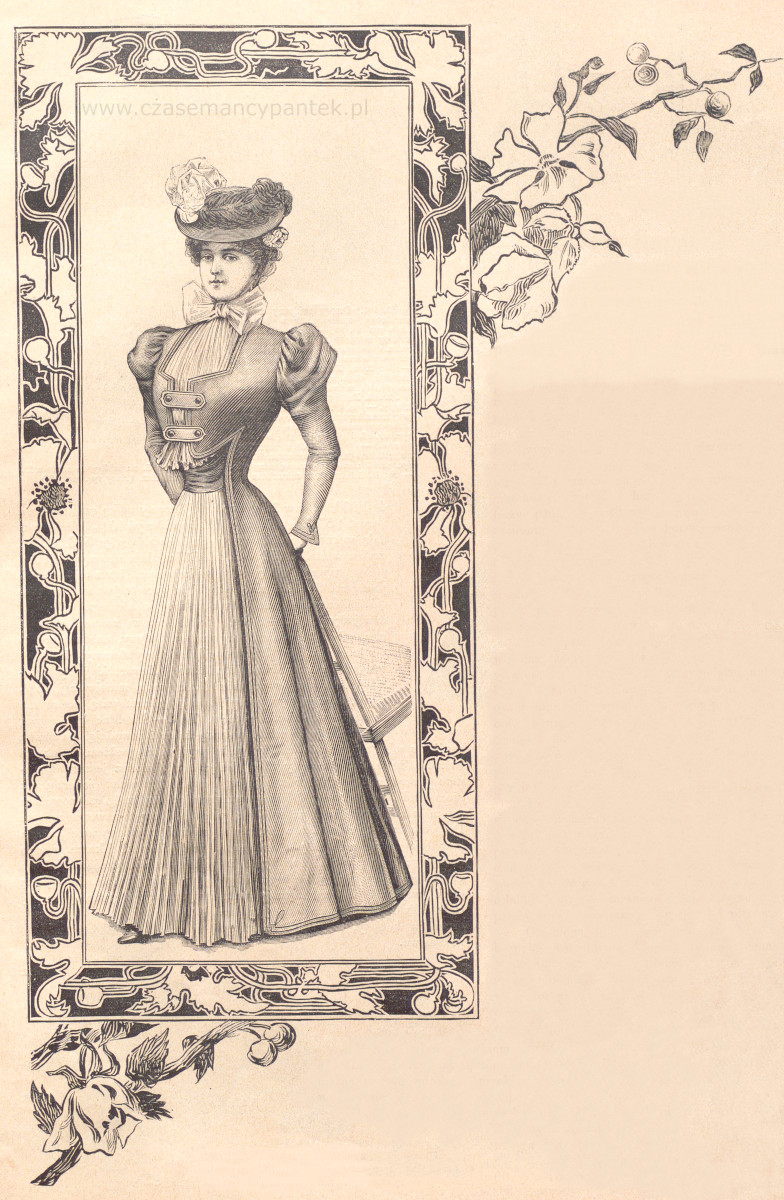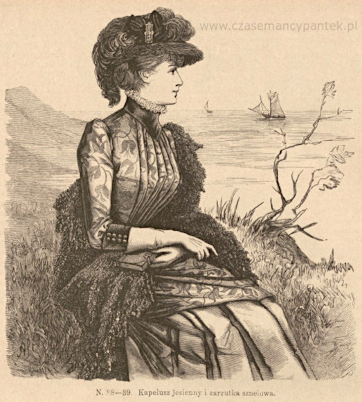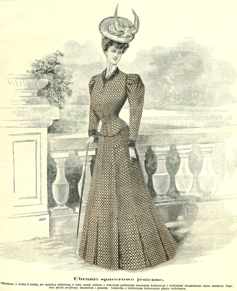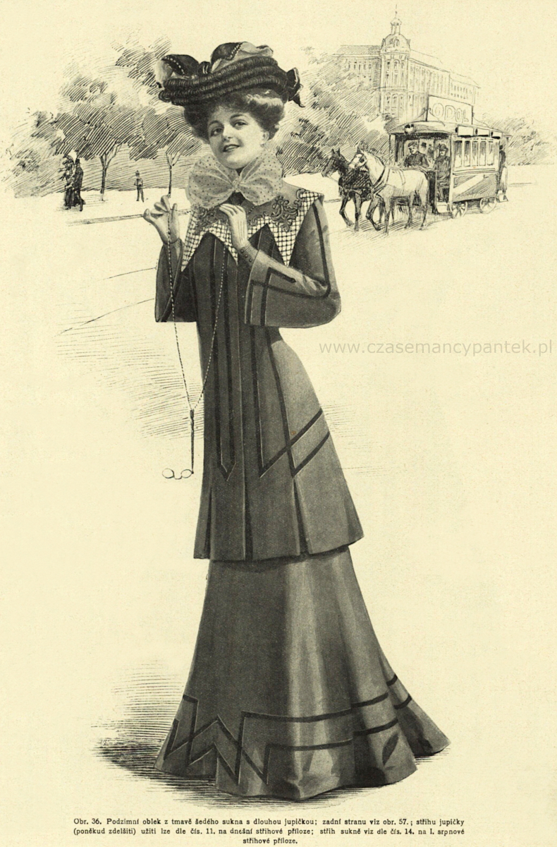 Okrywki jesienne zaczynają ukazywać się na ulicy. Do najświeższych należą z sukienka lub wigoniu w kolorze szafirowym albo wydrowym, przystają zupełnie do figury. Plecy ich złożone z trzech części, tworzą krótką żakietkę, na dwóch bocznych szwach idzie szlaczek wązki, wyszyty czarnym jedwabnym sutaszem. Przody także obcisłe, długie prawie do ziemi, spinają się na niewidzialne haftki. Po obu brzegach od ramienia do dołu, ciągnie się szlak bogato sutaszowany. Kołnierz do tego Medicis, podniesiony wysoko w górę, odwinięty po bokach. Rękawy szerokie, otwarte, u ramienia mocno namarszczone, podwinięte u ręki.