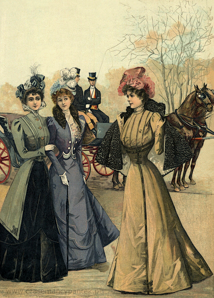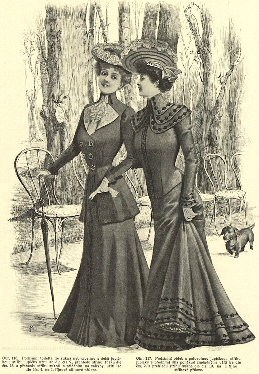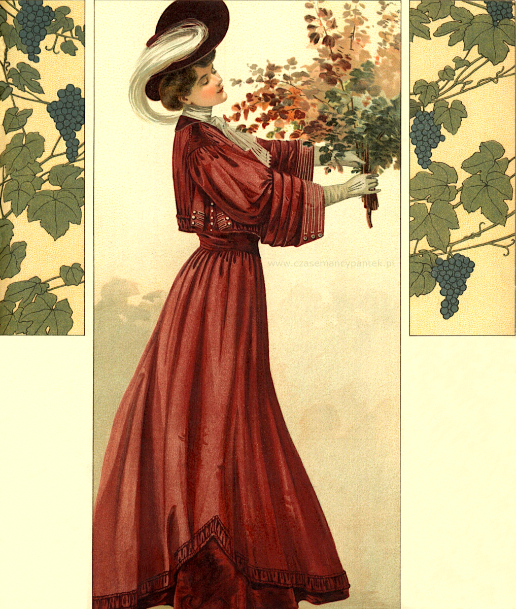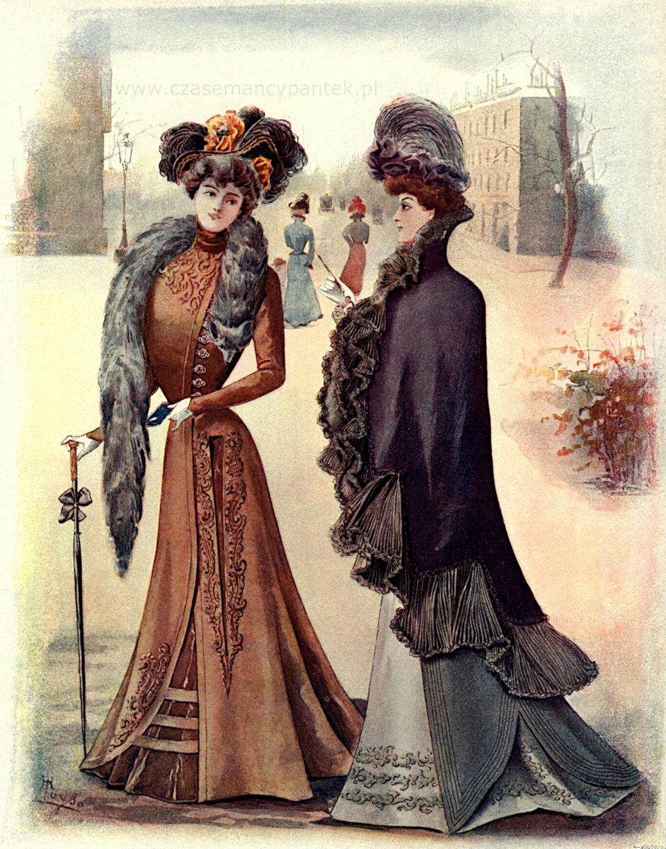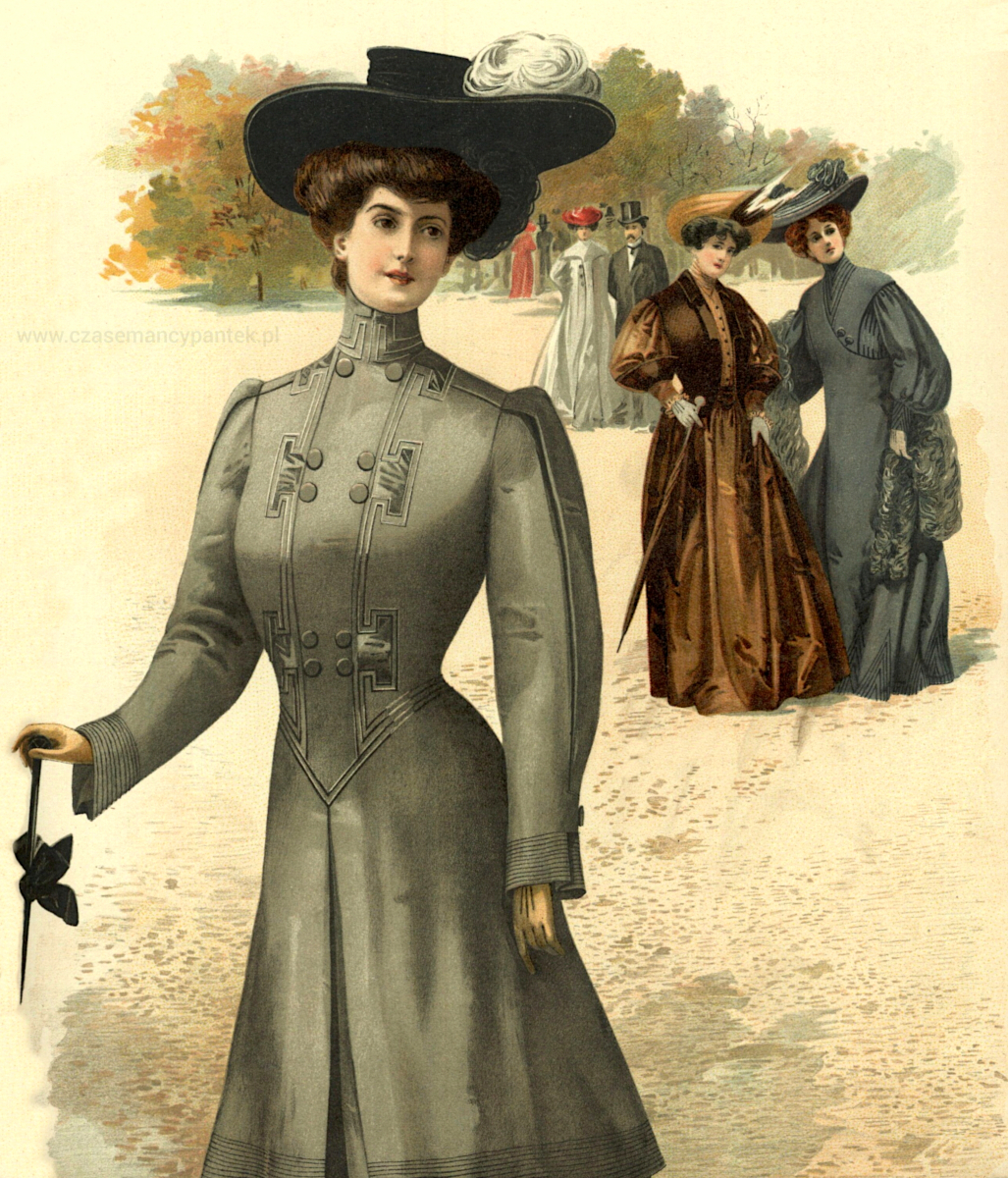 Okrywki jesienne zaczynają ukazywać się na ulicy. Do najświeższych należą z sukienka lub wigoniu w kolorze szafirowym albo wydrowym, przystają zupełnie do figury. Plecy ich złożone z trzech części, tworzą krótką żakietkę, na dwóch bocznych szwach idzie szlaczek wązki, wyszyty czarnym jedwabnym sutaszem. Przody także obcisłe, długie prawie do ziemi, spinają się na niewidzialne haftki. Po obu brzegach od ramienia do dołu, ciągnie się szlak bogato sutaszowany. Kołnierz do tego Medicis, podniesiony wysoko w górę, odwinięty po bokach. Rękawy szerokie, otwarte, u ramienia mocno namarszczone, podwinięte u ręki.