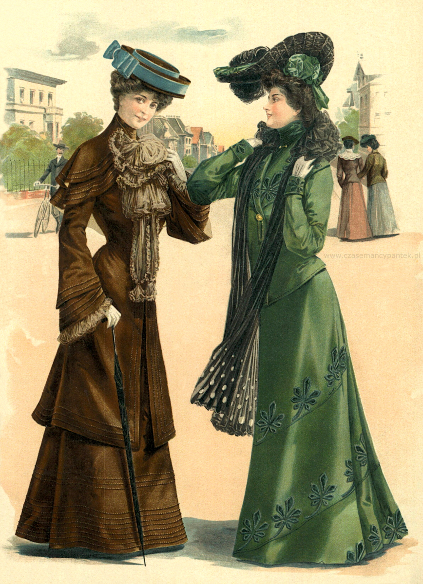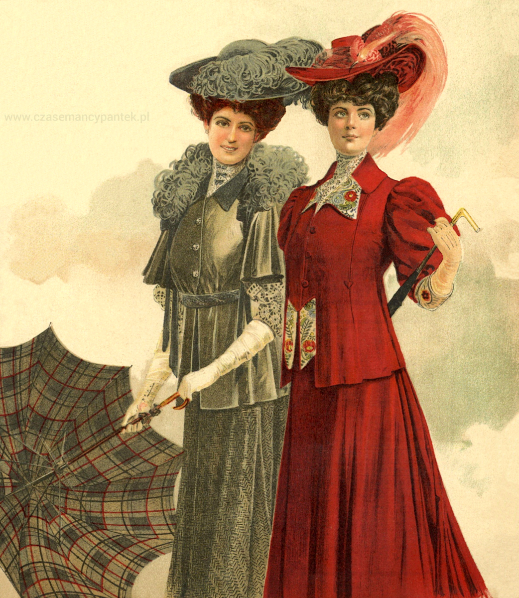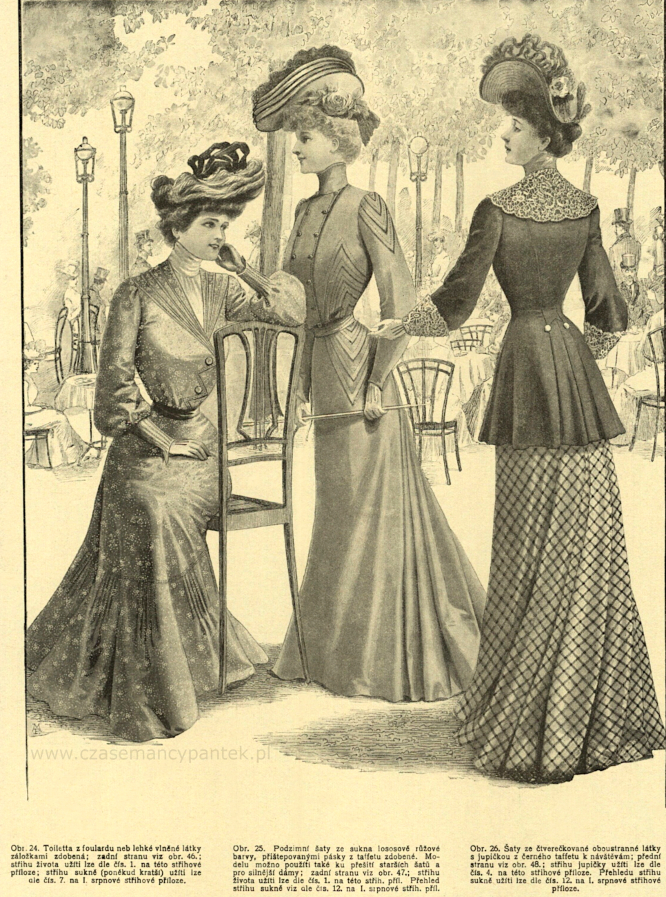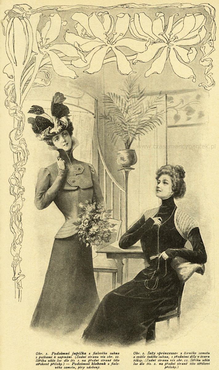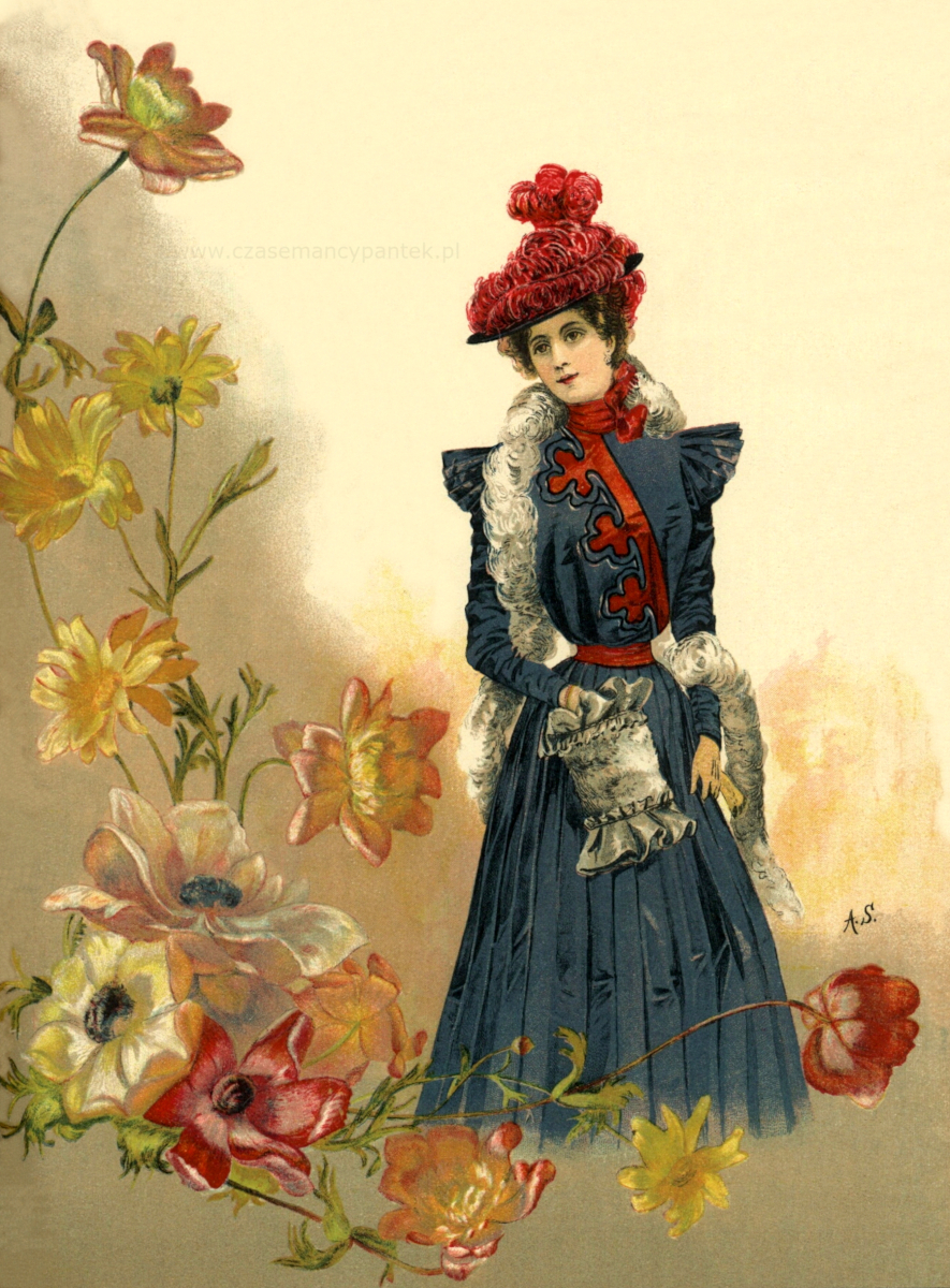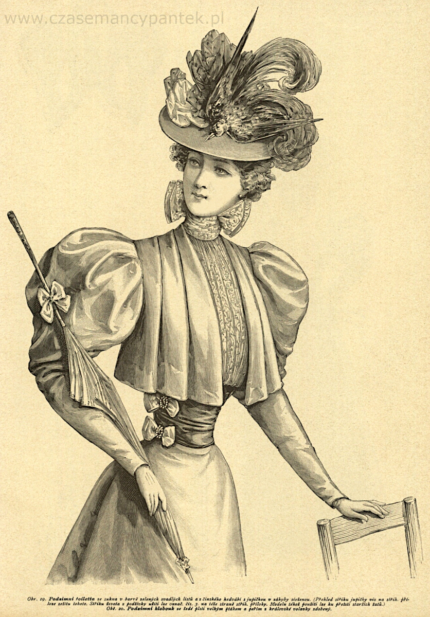 Okrywki jesienne zaczynają ukazywać się na ulicy. Do najświeższych należą z sukienka lub wigoniu w kolorze szafirowym albo wydrowym, przystają zupełnie do figury. Plecy ich złożone z trzech części, tworzą krótką żakietkę, na dwóch bocznych szwach idzie szlaczek wązki, wyszyty czarnym jedwabnym sutaszem. Przody także obcisłe, długie prawie do ziemi, spinają się na niewidzialne haftki. Po obu brzegach od ramienia do dołu, ciągnie się szlak bogato sutaszowany. Kołnierz do tego Medicis, podniesiony wysoko w górę, odwinięty po bokach. Rękawy szerokie, otwarte, u ramienia mocno namarszczone, podwinięte u ręki.
