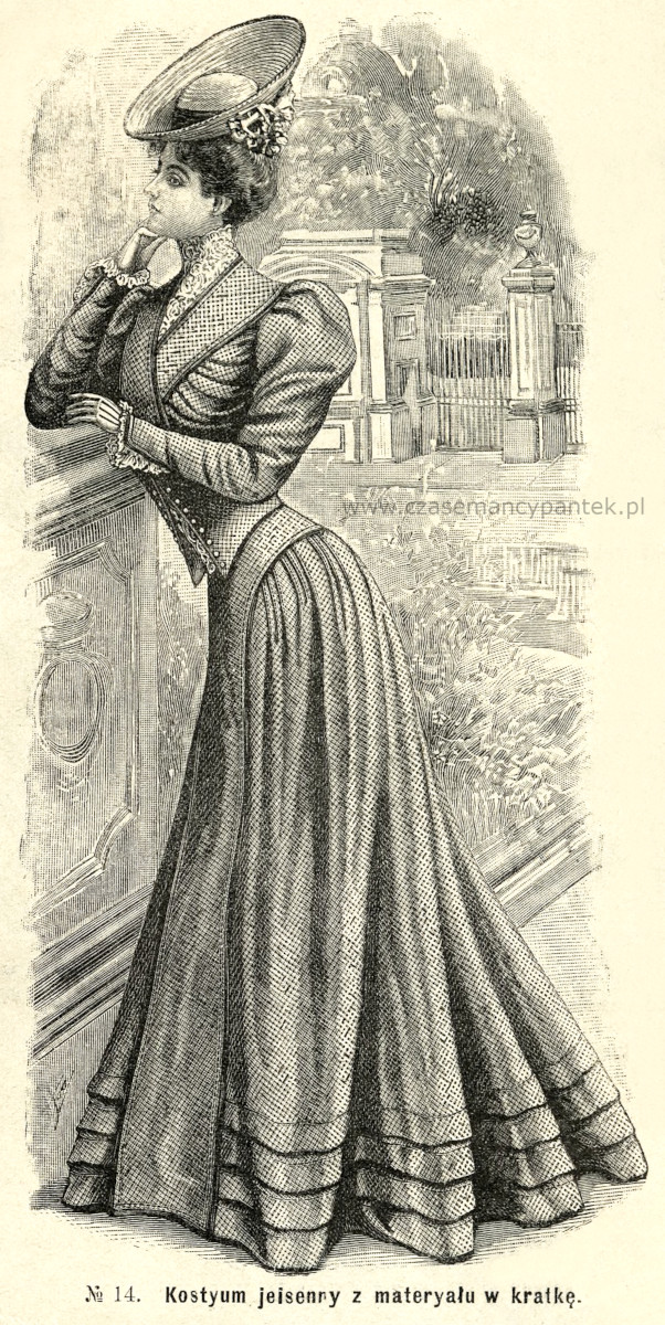 Zbyt długie suknie przestano już nosić jako spacerowe kostjumy — zmiana przy naszym dżdżystym klimacie jesiennym bardzo szczęśliwa (przypomnijmy sobie jak to przy zbyt długich okryciach, włóczonych po błocie wyglądały suknie, buciki i dolny brzeg okryć zaślepionych zwoleniczek mody!) zastrzegamy jednak że nie ma ona oznaczać przerzucenie się do zbyt krótkich kostjumów. Modny kostjum jesienny do wyjścia na ulicę nie dotyka zaledwie ziemi ale osłania stopy. Gładka forma również znika powoli z horyzontu; przedni bryt jest gładki, ale boki mają zakładki lub fałdki po trzy lub pięć. Z tyłu marszczki lub fałdy — zupełnie gładkich sukien nie ma; przy wielu dają karczki odcięte, ale ta forma możliwa tylko dla osób wysokich. Czytelniczkom spragnionym nowości, pragnącym uprzedzać modę, powiemy że wróżba powrotu krynoliny zaczyna krążyć w pierwszorzędnych pracowniach. Nie przerażajcie się jednak panie, że zgrabne wasze figury pochłonie bombiasta, ośmieszona krynolina jaką noszono przed 40 laty. To niemożliwe przy obecnem życiu ruchliwem, czynnem, przy upodobaniu do sportu wszelkiego rodzaju, przy nowych sposobach lokomocji! Jeżeli moda narzuci nam powrót krynoliny, to takowa byłaby tylko słabem odbiciem, zaledwie cieniem dawnej zmodernizowanym do warunków i upodobań chwili obecnej.